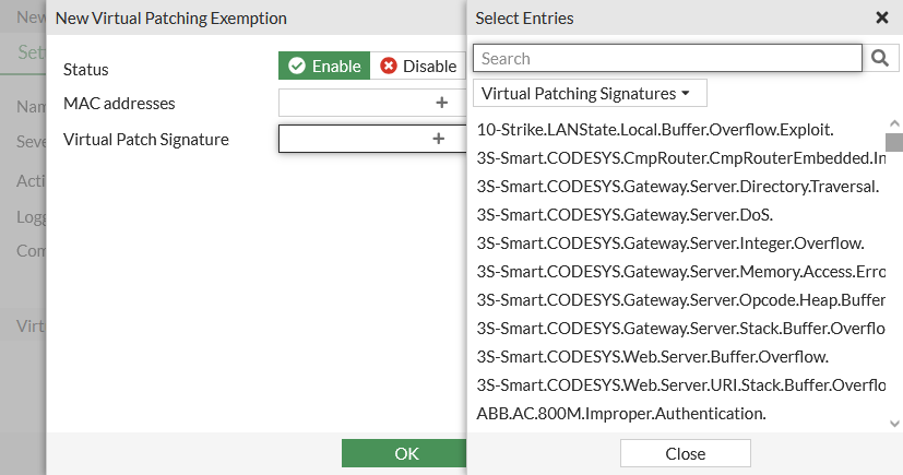 Set the device MAC addresses and virtual patch signatures to exempt.