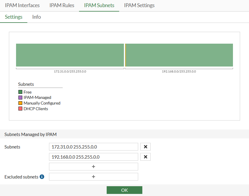 After performing a factory reset, enabled IPAM status will auto-generate two subnets. These subnets can be modified and deleted.