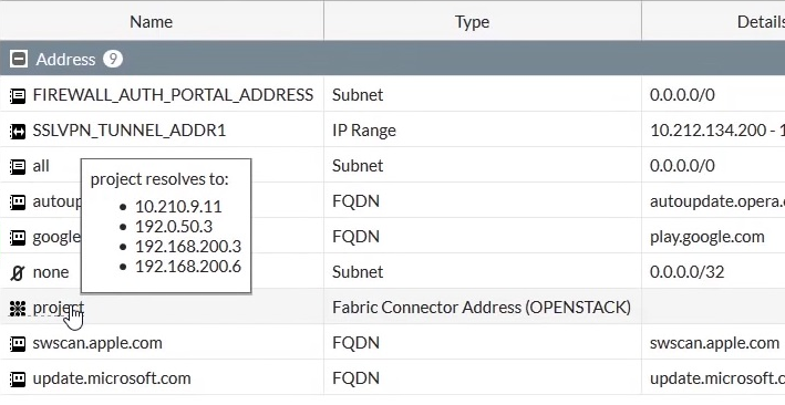No matter what changes occur to the instances, the SDN connector populates and updates the changes automatically based on the specified filtering condition so that administrators do not need to reconfigure the address content manually. Appropriate firewall policies using the address are applied to instances that are members of the address.