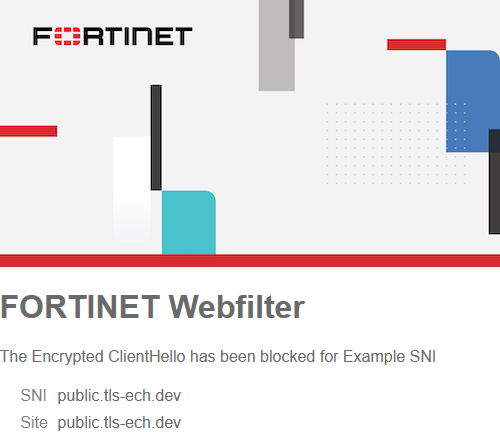 A webfilter block message will be shown when trying to connect directly to public.tls-ech.dev. Accessing the webpage tls-ech.dev, which uses public.tls-ech.dev in its outer SNI, will show that the client is not using ECH.