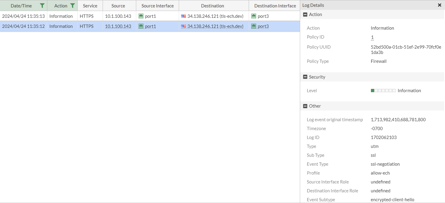 2: date=2024-04-24 time=11:13:31 eventtime=1713982410688781760 tz="-0700" logid="1702062103" type="utm" subtype="ssl" eventtype="ssl-negotiation" level="information" vd="vdom1" action="info" policyid=1 poluuid="52bd500a-01cb-51ef-2e99-70fcf0e1da3b" policytype="policy" sessionid=118528 service="HTTPS" profile="allow-ech" srcip=10.1.100.143 srcport=63232 srccountry="Reserved" dstip=34.138.246.121 dstport=443 dstcountry="United States" srcintf="port1" srcintfrole="undefined" dstintf="port3" dstintfrole="undefined" srcuuid="fbd0def6-01ca-51ef-496f-08c90cb6b123" dstuuid="fbd0def6-01ca-51ef-496f-08c90cb6b123" proto=6 eventsubtype="encrypted-client-hello" hostname="public.tls-ech.dev"