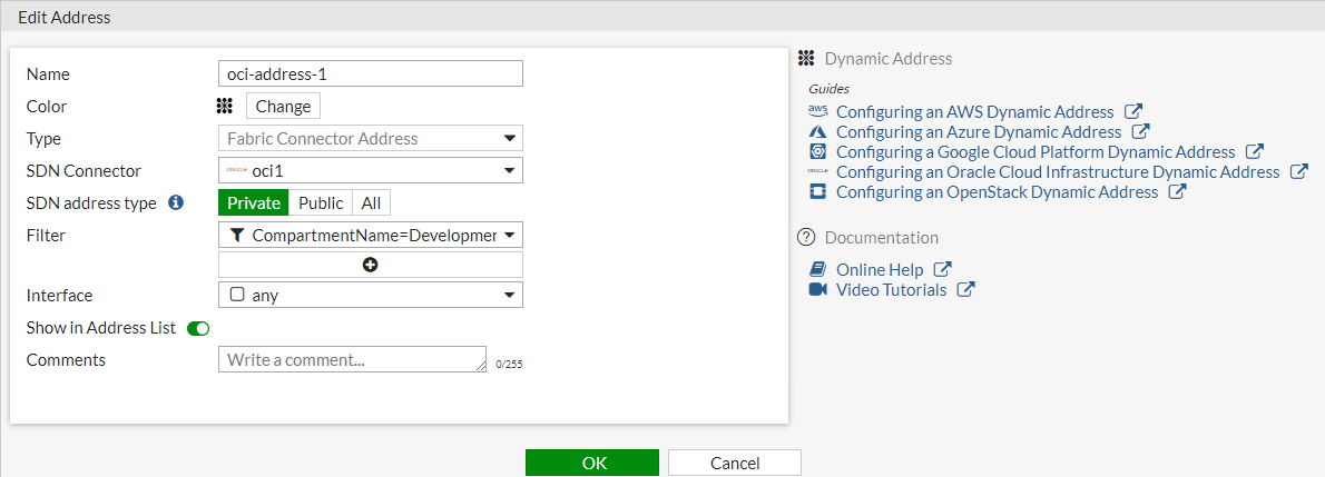 config firewall address edit "oci-address-1" set type dynamic set sdn "oci1" set filter "CompartmentName=DevelopmentEngineering" next end