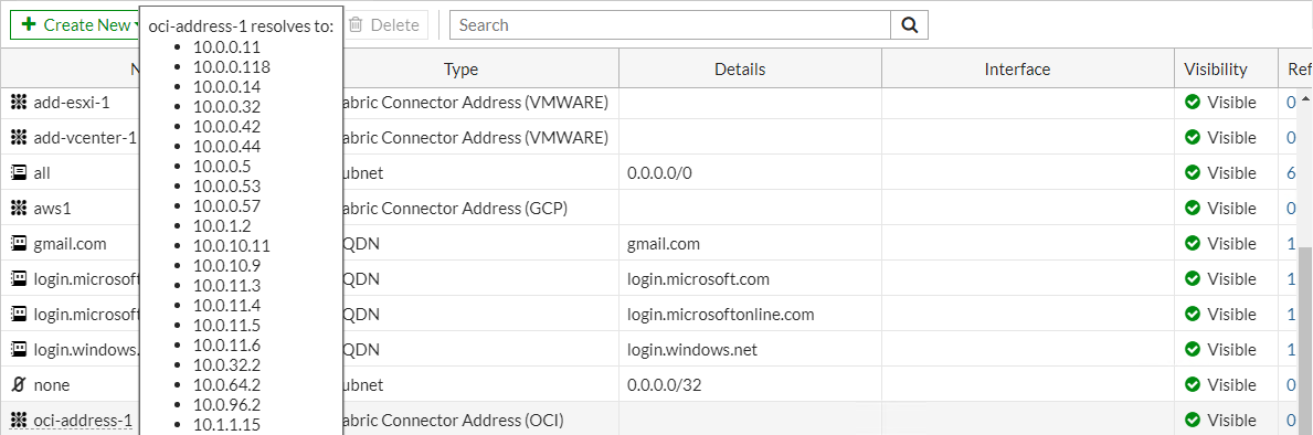 config firewall address edit "oci-address-1" set type dynamic set sdn "oci1" set filter "CompartmentName=DevelopmentEngineering" config list edit "10.0.0.11" next edit "10.0.0.118" next ... next end next end - In the GUI, go to Policy & Objects > Addresses and hover the cursor over the address name.