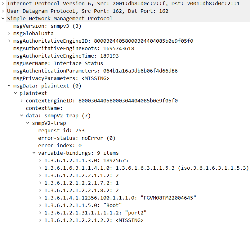The SNMP v3 trap is observed to be transmitted from port1 to the SNMP manager. It's also noteworthy that the msgAuthenticationParameters are configured, signifying that authentication is active. However, the absence of msgPrivacyParameters suggests that encryption is not in place, a fact further corroborated by the plaintext nature of the msgData.