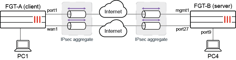 In this example, an IPsec aggregate tunnel is formed between two dial-up IPsec tunnels in order to support per-packet load balancing.