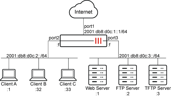 In this example, a host belonging to a specific range on the internal IPv6 network can communicate exclusively with the web server and FTP server.