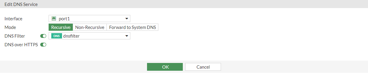 config system dns-server edit "port1" set dnsfilter-profile "dnsfilter" set doh enable next end -