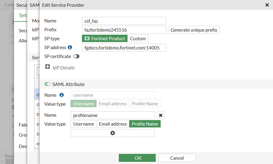 From a root FortiGate IdP, you can edit each of the FortiGate SPs. For example, you can edit a FortiGate SP to generate a new prefix, or you can add or modify SAML attributes. When you generate a new prefix value, it is propagated to the respective downstream FortiGates.