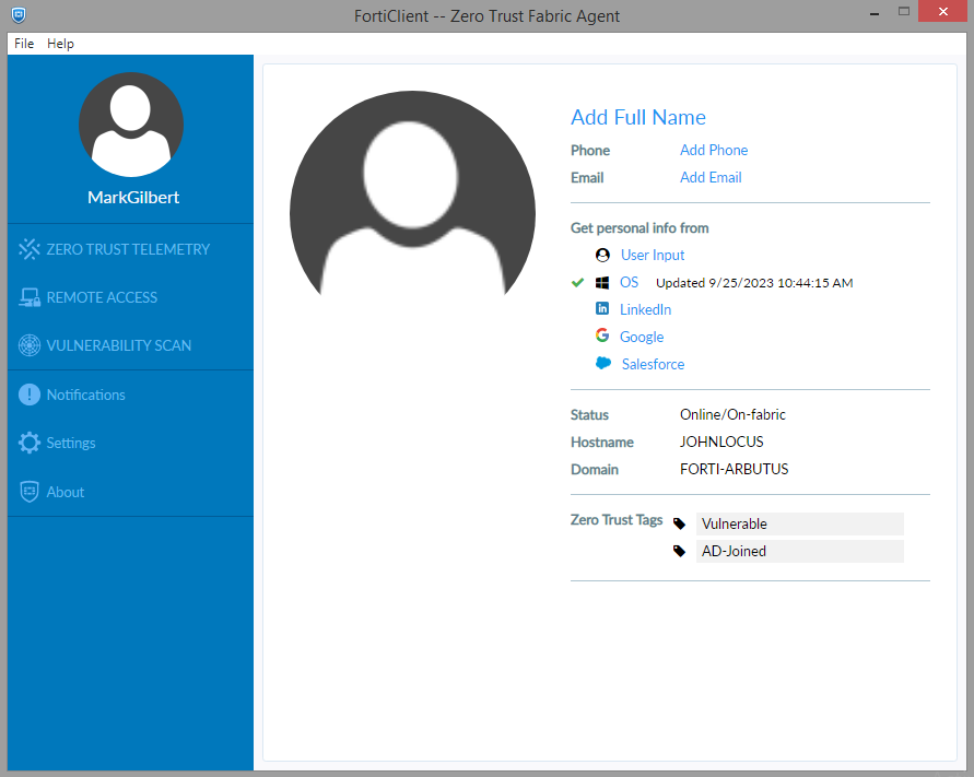 FortiClient discovered the vulnerability and added a Vulnerable ZTNA tag in addition to the existing AD-Joined tag.