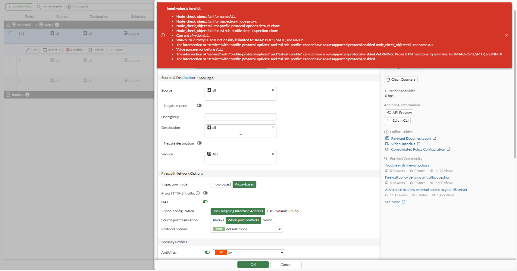Finally, if inspect-all is enabled in an SSL inspection profile, then the profile cannot be used in a proxy-based firewall policy.