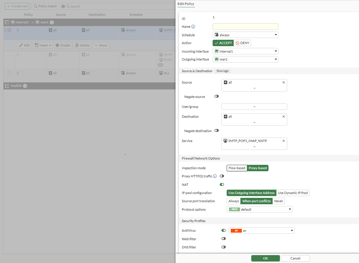 config firewall policy edit 1 set name "1" set uuid a85736ea-79dd-51ef-103d-0791ae4d6152 set srcintf "internal" set dstintf "wan1" set action accept set srcaddr "all" set dstaddr "all" set schedule "always" set service "SMTP_POP3_IMAP_NNTP" set utm-status enable set inspection-mode proxy set profile-protocol-options "default-clone" set ssl-ssh-profile "deep-inspection-clone" set av-profile "av" set logtraffic all set nat enable next end