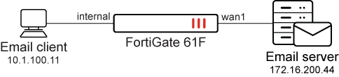 In this example, a firewall policy is configured to scan email traffic sent from an email client through FortiGate to an email server. The firewall policy is configured with a proxy-based inspection mode and mail services and profiles. The FortiGate 61F has less than 2 GB RAM.