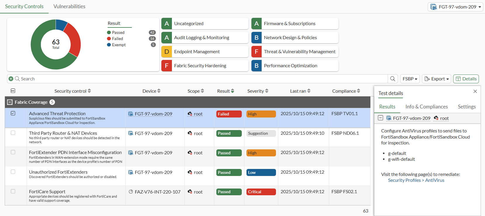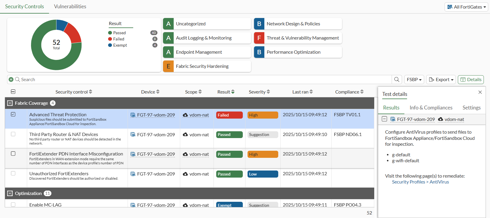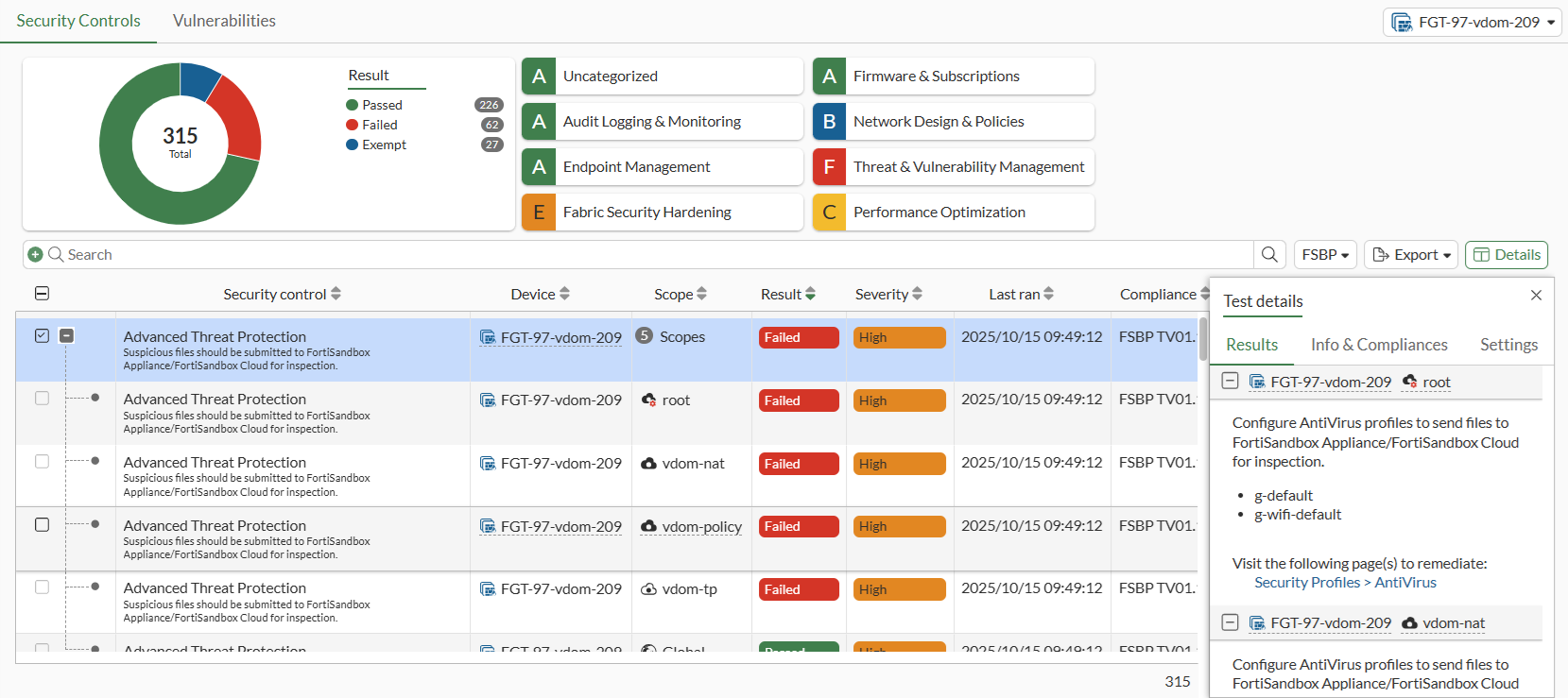 Security Rating is visible in the VDOM scope for global administrators, and is displayed in both the Global and VDOM scopes.