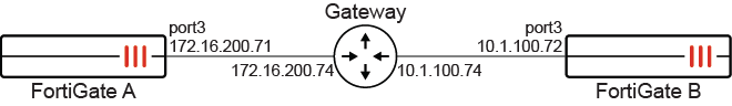 In this example, two FortiGates in different subnets are connected through a unicast gateway. Both cluster members use the same port for the heartbeat interface.