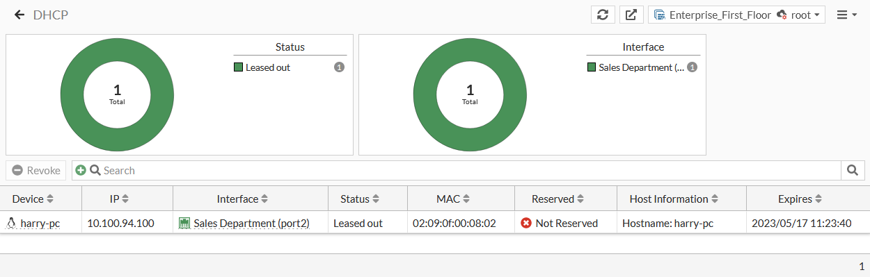 The DHCP monitor shows all the addresses leased out by FortiGate's DHCP servers. You can use the monitor to revoke an address for a device, or create, edit, and delete address reservations.