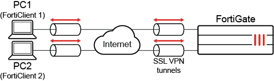 In this example, two PCs connect to the VPN. SSL VPN is configured to use round robin IP address assignment. Dual stack address assignment (both IPv4 and IPv6) is used.
