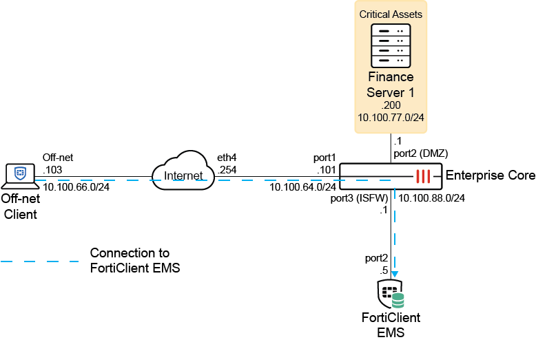 Enterprise Core is the FortiGate that acts as the SSL VPN server. To configure SSL VPN, refer to SSL VPN and SSL VPN security best practices. Critical Assets are network resources that the off-net user tries to access after connecting to the VPN. SSL VPN is used in this example, but a similar configuration also applies to dialup IPsec VPN where the FortiGate acts as a dialup server.