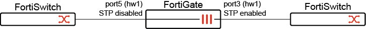 In this example, FortiGate is connected to two switches, and a virtual switch named hw1 is configured with two port members: port3 and port5. STP is enabled for port3 and disabled for port5. Any STP sent to port5 is silently ignored. Port3 remains enabled for STP.