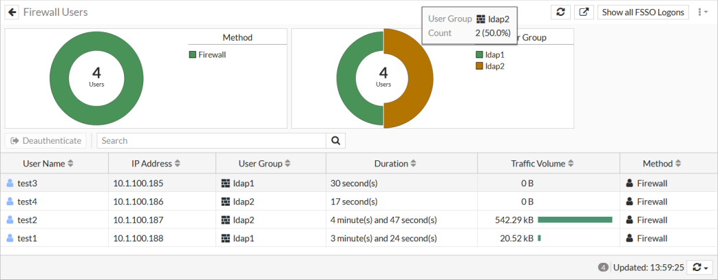 6. Get users test3 and test4 to log in, and refresh the Firewall Users widget. Each LDAP group has two users logged in, with a total of four active users.