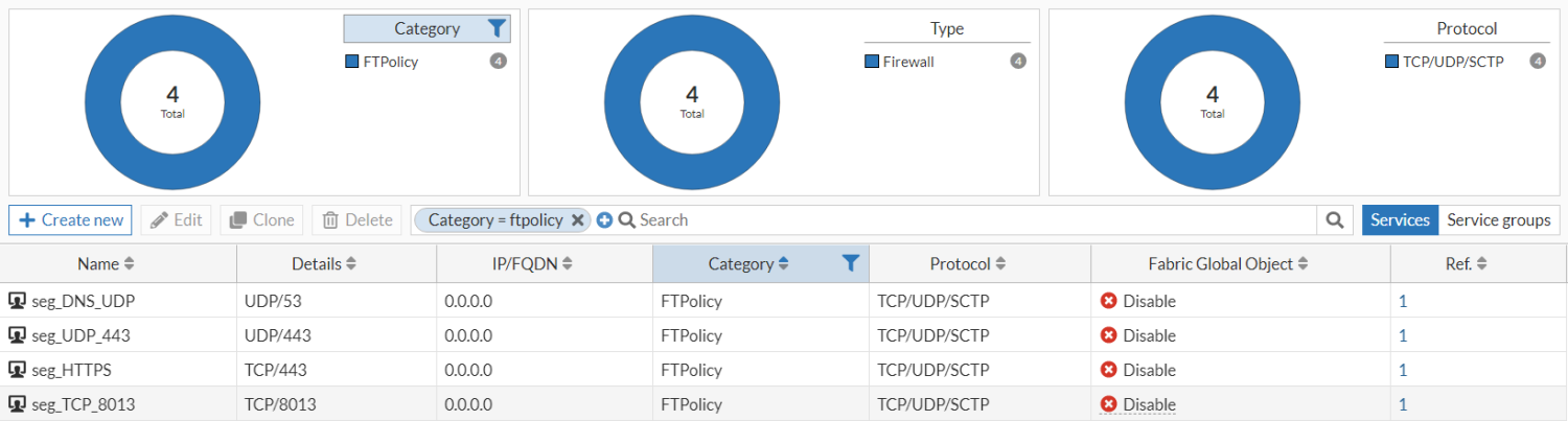 Go to Policy & Objects > Services to view the service objects associated with the policy (seg_DNS_UDP, seg_UDP_443, seg_HTTPS, and seg_TCP_8013).