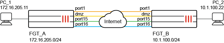 In this example, four SD-WAN members in two zones are configured. The remote PC (PC_2 - 10.1.100.22) is accessible on port15 and port16, even though there are valid routes for all of the SD-WAN members. A single SD-WAN service rule is configured that allows traffic to balanced between all four of the members, but only chooses between port15 and port16 for the specific 10.1.100.22 address. If neither port15 nor port16 meet the SLAs, traffic will be forwarded on one of these interfaces, instead of on port1 or dmz.