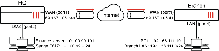In this example, users in the Branch LAN subnet require connectivity with the HQ DMZ subnet to access servers with IPsec VPN. The IP address of the Branch's Internet (port1) interface is assigned dynamically using DHCP.