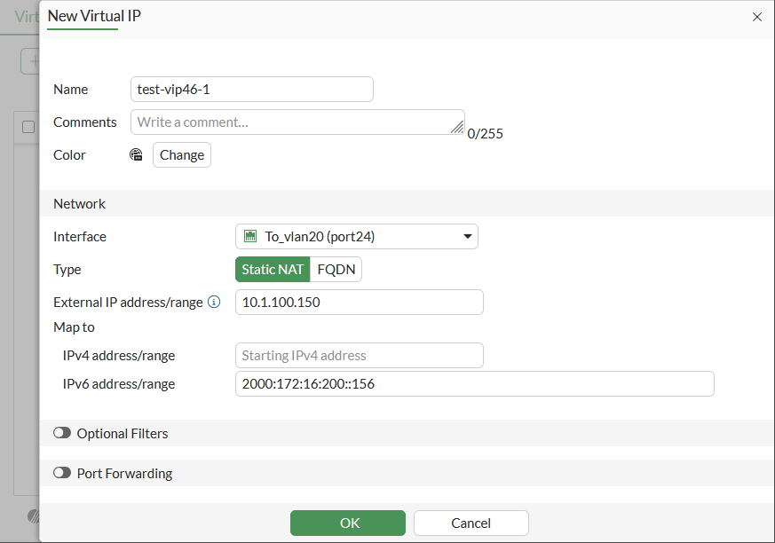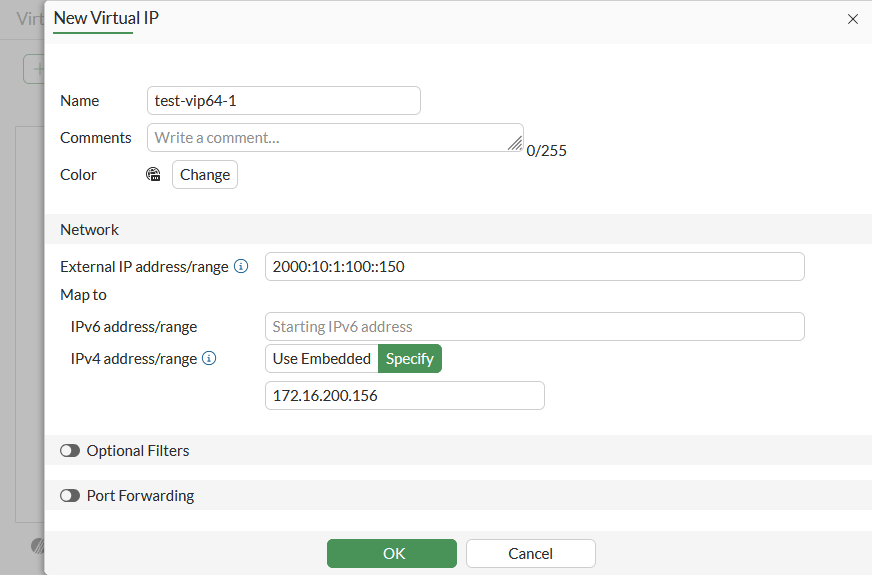 config firewall vip6 edit "test-vip64-1" set extip 2000:10:1:100::150 set nat66 disable set nat64 enable set ipv4-mappedip 172.16.200.156 next end - Configure the VIP with the embedded IPv4 address enabled: