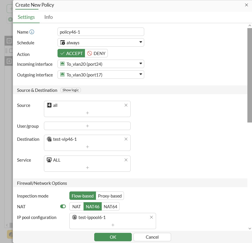 config firewall policy edit 2 set name "policy46-1" set srcintf "port24" set dstintf "port17" set action accept set nat46 enable set srcaddr "all" set dstaddr "test-vip46-1" set srcaddr6 "all" set dstaddr6 "all" set schedule "always" set service "ALL" set logtraffic all set auto-asic-offload disable set ippool enable set poolname6 "test-ippool6-1" next end