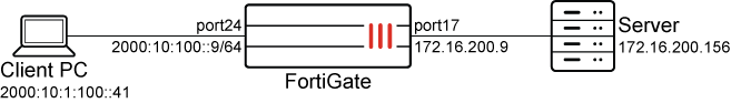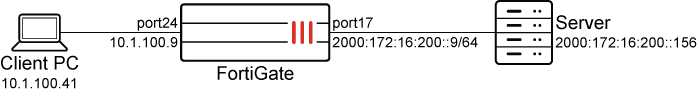 In this example, a client PC is using IPv6 and an IPv6 VIP to access a server that is using IPv4. The FortiGate uses NAT64 to translate the request from IPv6 to IPv4 using the virtual interface naf.root. An ippool is applied so that the request is SNATed to the ippool address (172.16.101.2 - 172.16.101.3).