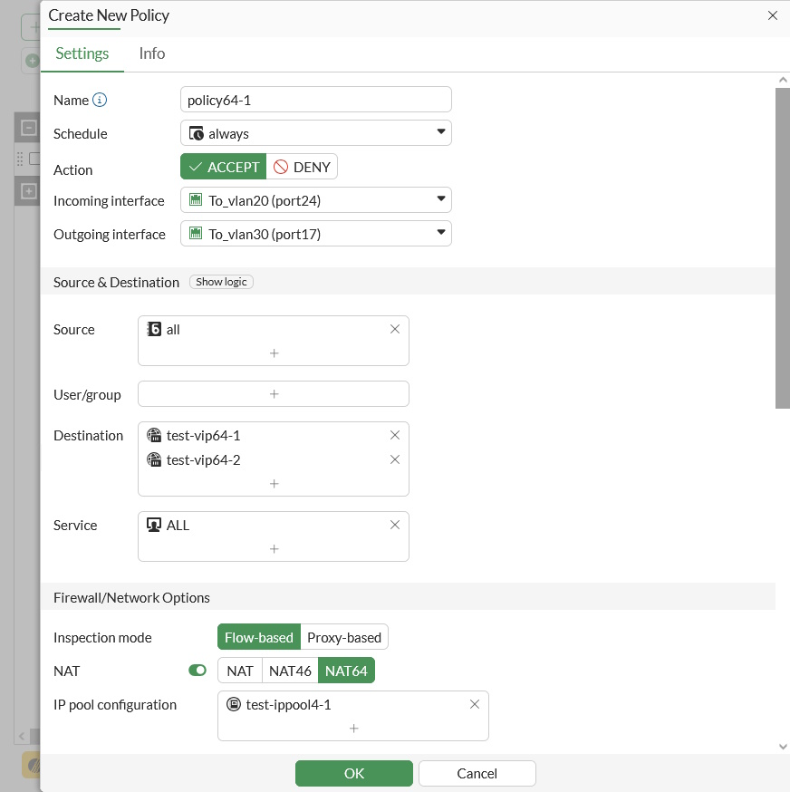 config firewall policy edit 1 set name "policy64-1" set srcintf "port24" set dstintf "port17" set action accept set nat64 enable set srcaddr "all" set dstaddr "all" set srcaddr6 "all" set dstaddr6 "test-vip64-1" "test-vip64-2" set schedule "always" set service "ALL" set logtraffic all set auto-asic-offload disable set ippool enable set poolname "test-ippool4-1" next end