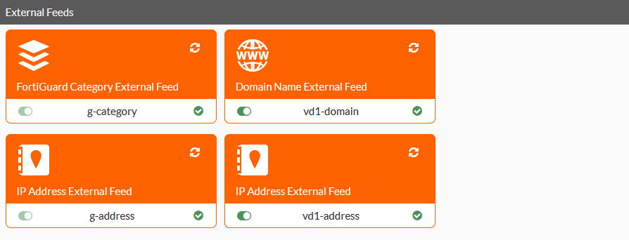 When multi-VDOM mode is enabled, an external feed connector can be defined in global or within a VDOM. Global external feeds can be used in any VDOM, but cannot be edited within the VDOM. FortiGuard category and domain name-based external feeds have an added category number field to identify the external feed. The external feed name in global must start with g-. External feed names in VDOMs cannot start with g-.