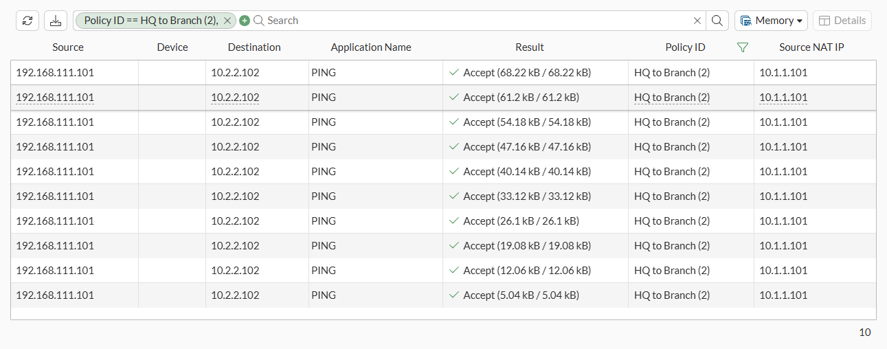 Branch # diagnose sniffer packet any 'icmp' 4 10 Using Original Sniffing Mode interfaces=[any] filters=[icmp] 5.738981 BranchtoHQVPN in 10.1.1.101 -> 10.2.2.102: icmp: echo request 5.739058 port4 out 10.1.1.101 -> 192.168.111.102: icmp: echo request 5.740026 port4 in 192.168.111.102 -> 10.1.1.101: icmp: echo reply 5.740068 BranchtoHQVPN out 10.2.2.102 -> 10.1.1.101: icmp: echo reply