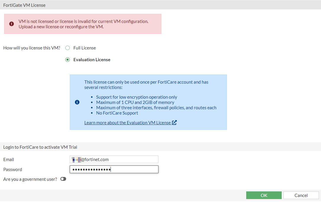 - When unlicensed, the FortiOS GUI allows you to download the permanent VM trial license from FortiCare with your FortiCare account credentials. In the FortiGate VM License page, for How will you license this VM?, select Evaluation License.