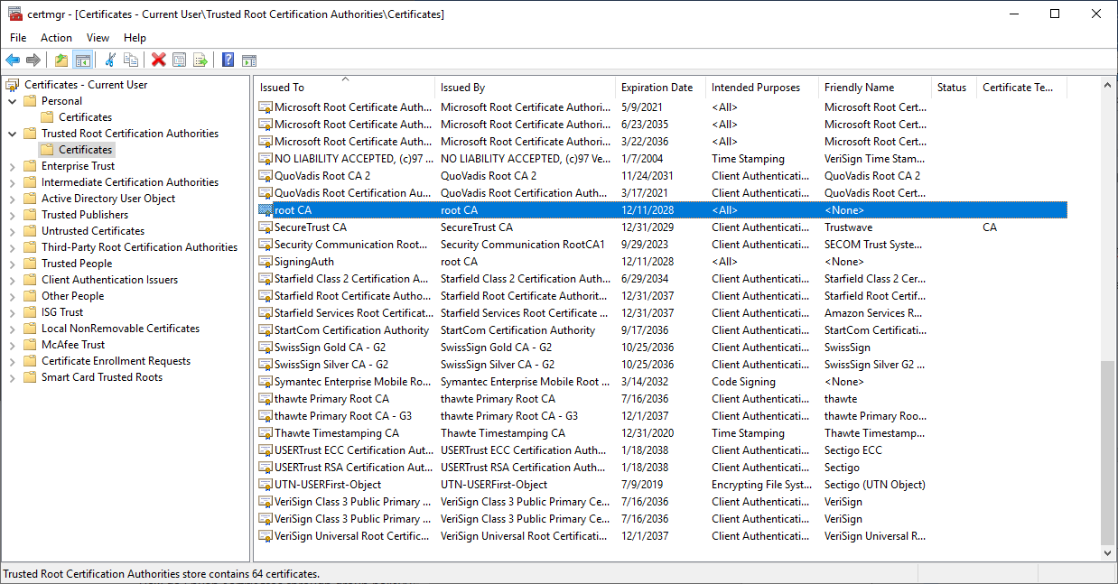 3. Go to Trusted Root Certification Authorities > Certificates. The company CA certificate should be listed.