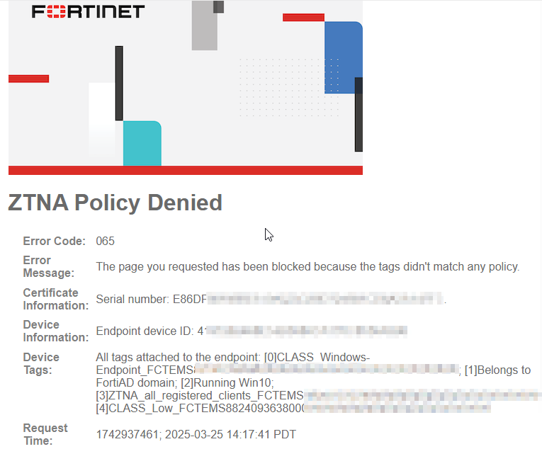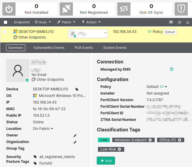 clientdevicetags, and it indicates the tags registered to the endpoint. Low-Risk is not associated with this endpoint.# execute log filter field subtype ztna # execute log display 5 logs found. 5 logs returned. 7: date=2025-03-25 time=14:17:42 eventtime=1742937461544682088 tz="-0700" logid="0005000024" type="traffic" subtype="ztna" level="notice" vd="root" srcip=192.168.34.43 srcport=56662 srcintf="port1" srcintfrole="undefined" dstcountry="Reserved" srccountry="Reserved" dstip=192.168.34.181 dstport=443 dstintf="root" dstintfrole="undefined" sessionid=2811 service="HTTPS" proxyapptype="http" proto=6 action="deny" policyid=0 policytype="policy" trandisp="dnat" tranip=192.168.34.181 tranport=443 appcat="unscanned" duration=0 vip="ZTNA-server" accessproxy="ZTNA-server" clientdeviceid="4197282468E54B0080CA170C8536A596" clientdevicemanageable="manageable" clientdeviceems="FCTEMS8824093638" clientdevicetags="CLASS_Windows-Endpoint/FortiAD/Windows10/all_registered_clients/CLASS_Low" clientcert="yes" emsconnection="online" msg="Traffic denied because failed to match a policy or proxy-policy" wanin=0 rcvdbyte=0 wanout=0 lanin=3710 sentbyte=3710 lanout=7061 fctuid="4197282468E54B0080CA170C8536A596" crscore=30 craction=13107 crlevel="high"