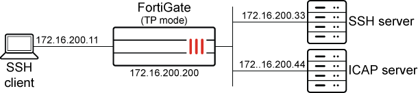 The FortiGate used in this example is operating in transparent mode. The SSH client, 172.16.200.11, sends a file named today to the SSH server at 172.16.200.33 using SCP. Since SCP transfers are encrypted inside an SSH tunnel, for the FortiGate to scan the traffic, deep inspection must be enabled in the SSL SSH profile.