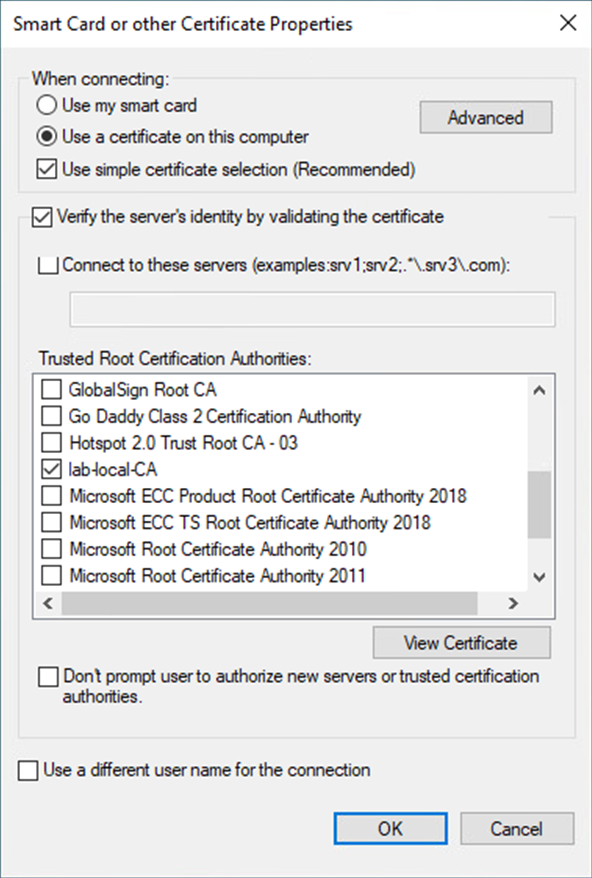 5. In the Trusted Root Certificate Authorities list, select the CA lab-local-CA.