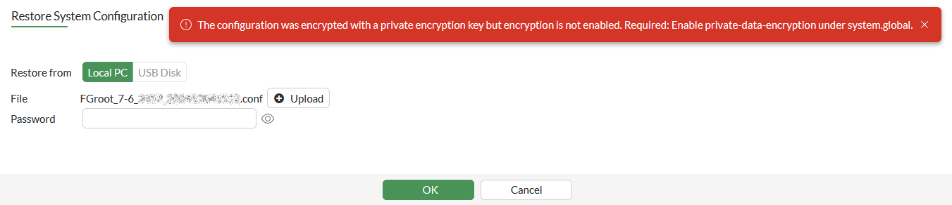 You cannot restore a private key-encrypted configuration via the FortiOS GUI if private-data-encryption is disabled. The following shows the GUI in this scenario: