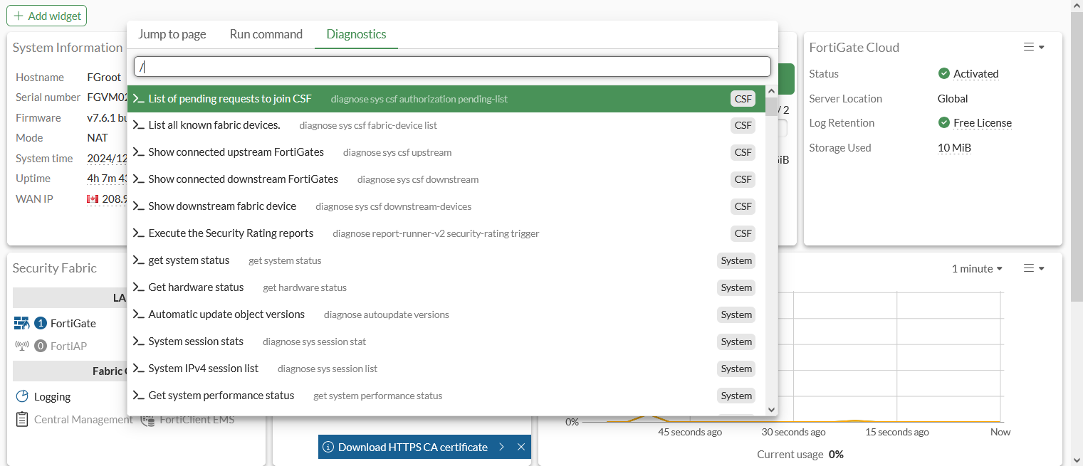 Run a diagnostic CLI command without the CLI console. Recently used commands are listed first. Once a command has been selected, you can search within the output, copy the output, download an output file, and run the command again. |