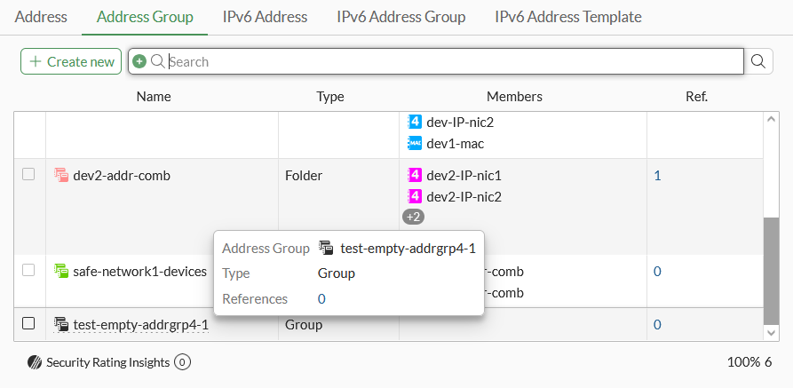 Address groups with no members can be configured in the GUI, CLI, and through the API. In previous versions of FortiOS, error messages appear for empty address groups and they cannot be configured.