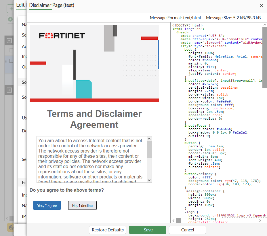 Per-policy custom disclaimers in each VDOM are supported. For example, you may want to configure three firewall policies, each of which matches traffic from endpoints with different FortiClient statuses: