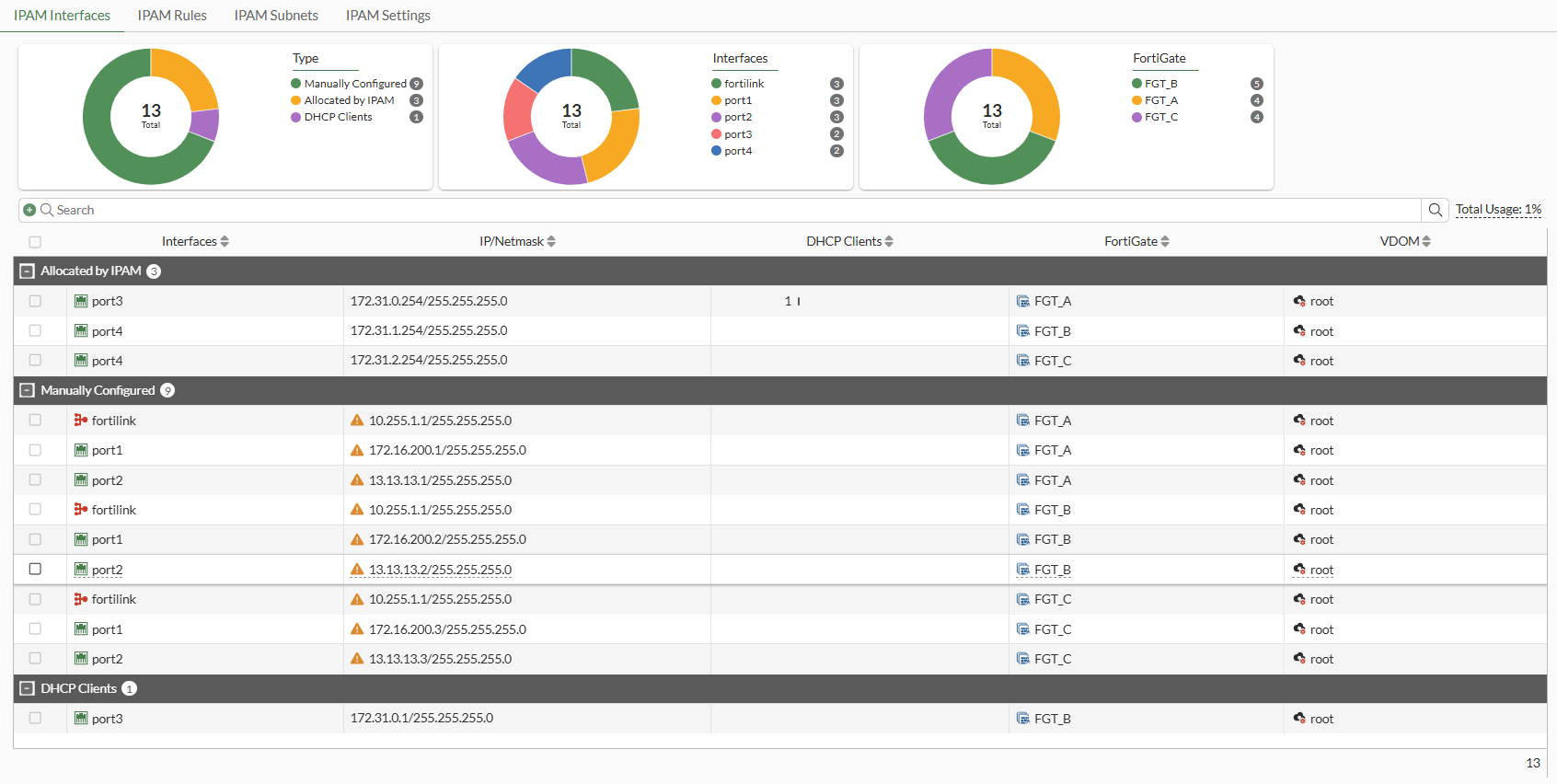 IPAM Interfaces, IPAM Rules, and IPAM Subnets can only be viewed or configured from the root FortiGate in a Security Fabric or from a standalone FortiGate. Additionally, IPAM Settings can only be enabled or disabled from the root FortiGate in a Security Fabric or from a standalone FortiGate. |