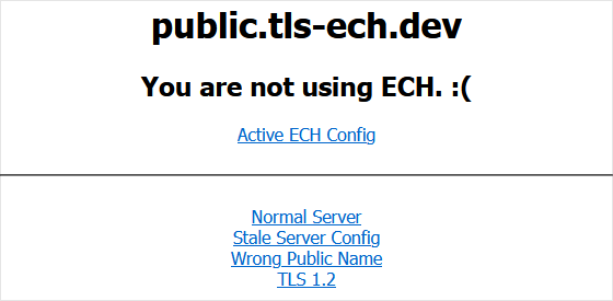 In a browser, go to https://public.tls-ech.dev to see that ECH is not being used: