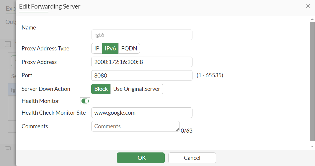 The IPv6-enabled forward server works the same way as the IPv4 forward server. For example, you can configure an IPv6 address or an FQDN that resolves to an IPv6 address for the forward server, and you can also use the IPv6 forward server in a forward server group.