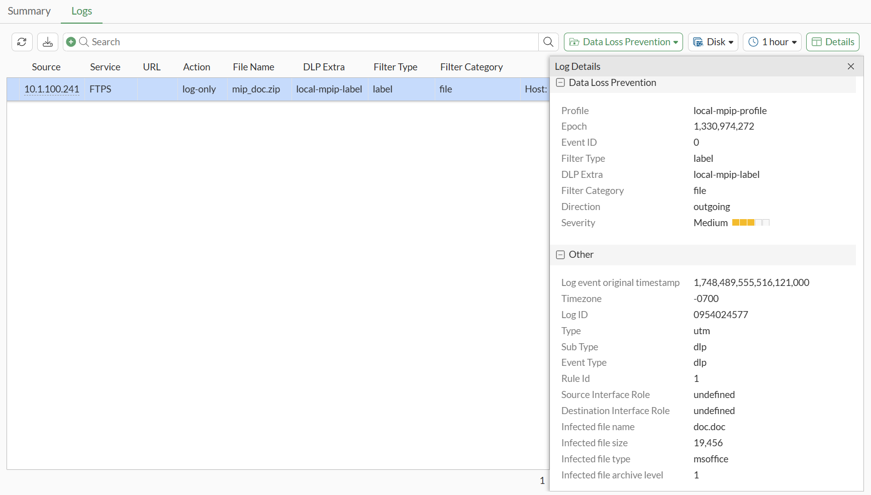 1: date=2025-05-28 time=20:32:35 eventtime=1748489555516121022 tz="-0700" logid="0954024577" type="utm" subtype="dlp" eventtype="dlp" level="notice" vd="vdom1" ruleid=1 dlpextra="local-mpip-label" filtertype="label" filtercat="file" severity="medium" policyid=1 poluuid="319d6e9e-3c23-51f0-3a27-434de0e559ee" policytype="policy" sessionid=8379 epoch=1330974272 eventid=0 srcip=10.1.100.241 srcport=57865 srccountry="Reserved" srcintf="port2" srcintfrole="undefined" srcuuid="f9cd0f6a-3c22-51f0-b75c-6fad5f412db5" dstip=172.16.200.175 dstport=38353 dstcountry="Reserved" dstintf="port1" dstintfrole="undefined" dstuuid="f9cd0f6a-3c22-51f0-b75c-6fad5f412db5" proto=6 service="FTPS" filetype="zip" direction="outgoing" action="log-only" filename="mip_doc.zip" filesize=5470 profile="local-mpip-profile" infectedfilename="doc.doc" infectedfilesize=19456 infectedfiletype="msoffice" infectedfilelevel=1