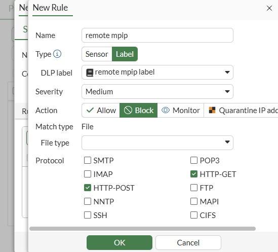 4. Configure the DLP profile with the new DLP label applied in a rule set to block HTTP-POST and HTTP-GET. See Basic DLP settings for more information.