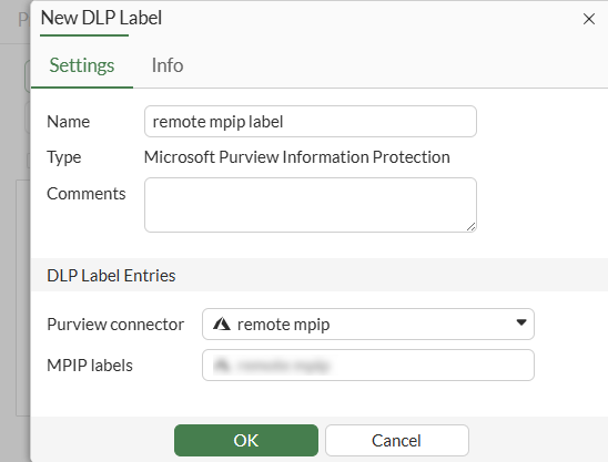 Local MPIP label configuration is not supported in the GUI. However, once the local MPIP label has been configured in the CLI, it can be applied to a DLP profile in the GUI. See Basic DLP settings.