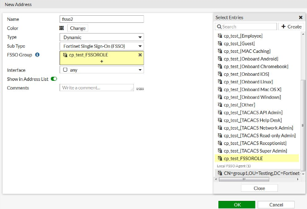 config firewall address edit "fsso" set type dynamic set sub-type fsso set fsso-group "cp_test_FSSOROLE" next end -