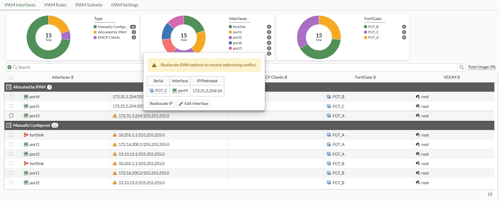 When automatic-conflict-resolution is enabled, IPAM will periodically check and validate the addresses of all interfaces. In case of any conflicts, IPAM will automatically attempt to obtain a new address for the affected interface managed by IPAM, ensuring no address duplication. Additionally, it also prevent conflicts when new FortiGates join the Security Fabric.