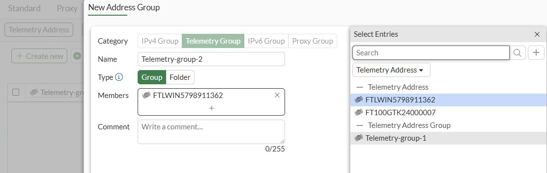 Telemetry-group-1is for a hardware agent. Thetypecan bedefaultorfolder, and thecategoryistelemetry. The member is theFT100GTK24000007telemetry address:config firewall addrgrp edit "Telemetry-group-1" set type default set category telemetry set member "FT100GTK24000007" set comment '' set uuid 4f197cee-4d65-51f0-2942-8214af708a17 set exclude disable set color 0 set fabric-object disable next end -